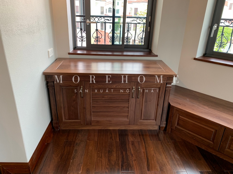 Thi công một kệ tủ gỗ óc chó tân cổ điển để tô điểm trang trí cho không gian với những ngăn tủ tiện lợi giúp sắp xếp không gian một cách gọn gàng và thẩm mỹ.